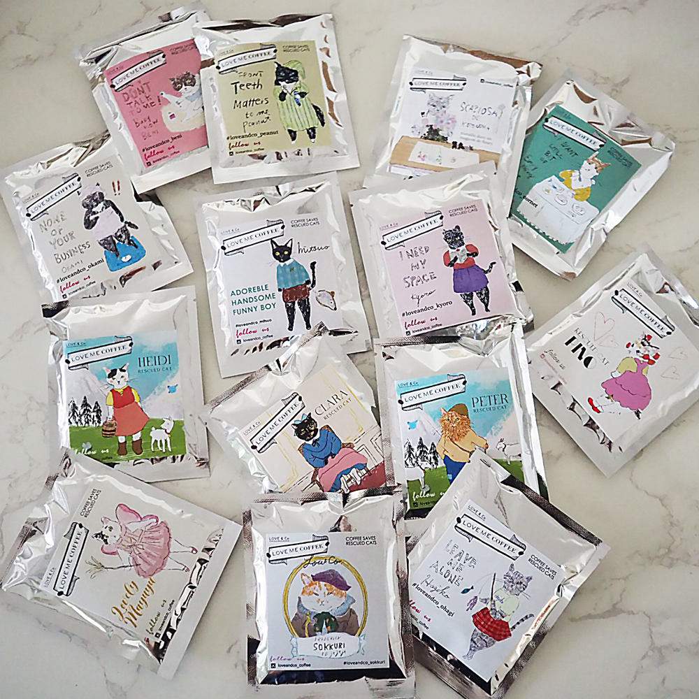 現役のラブコCATS (家族募集中の猫)たち全種類のラベルが揃うドリップコーヒーセットです。