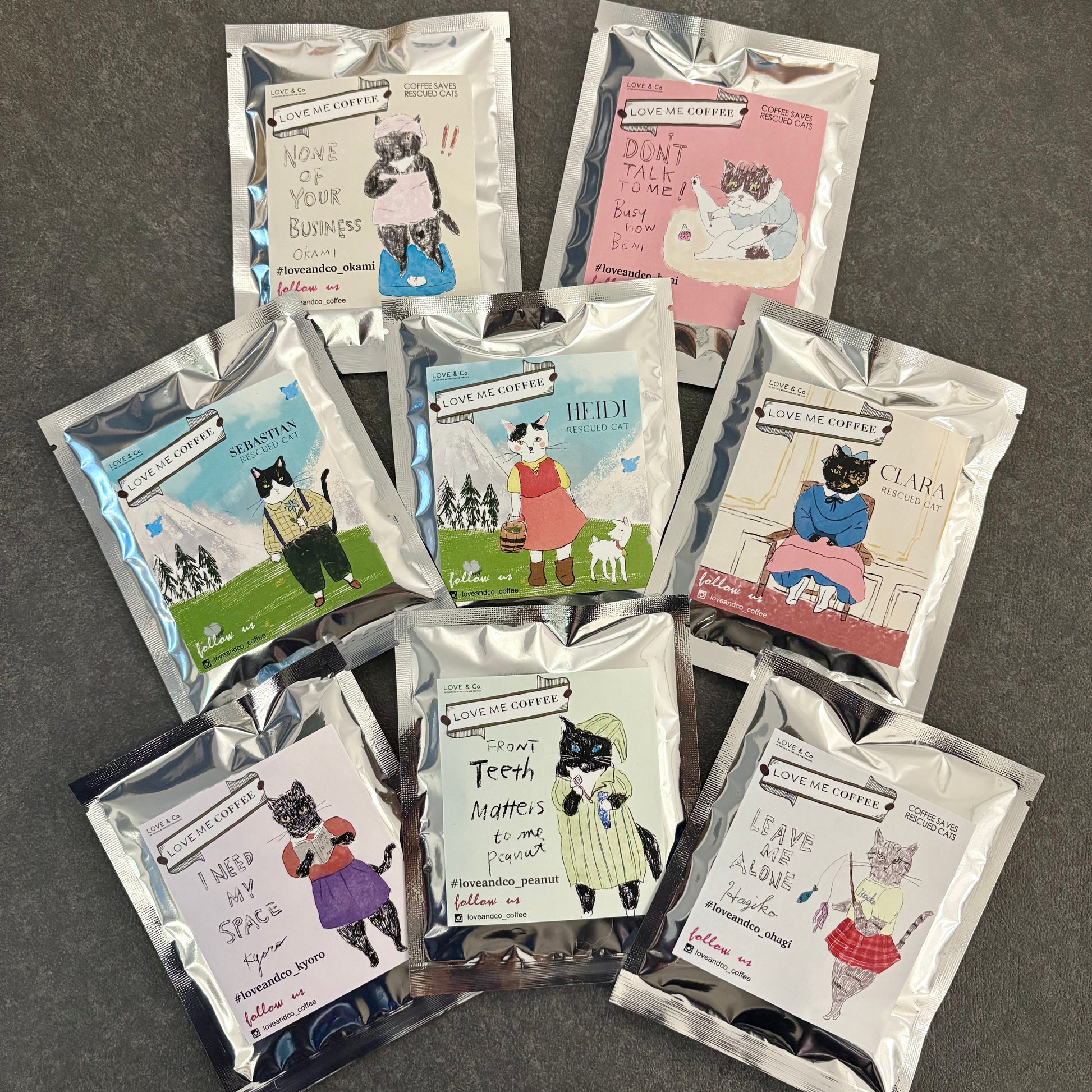 現役のラブコCATS (家族募集中の猫)たち全種類のラベルが揃うドリップコーヒーセットです。