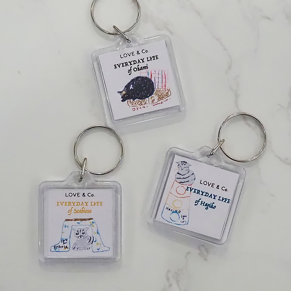 ラブコオフィスのCATS トリオの日常を切り取ってイラストにしたシリーズのキーホルダーです。
