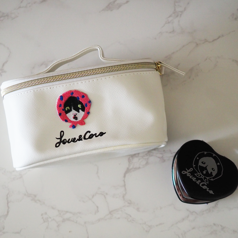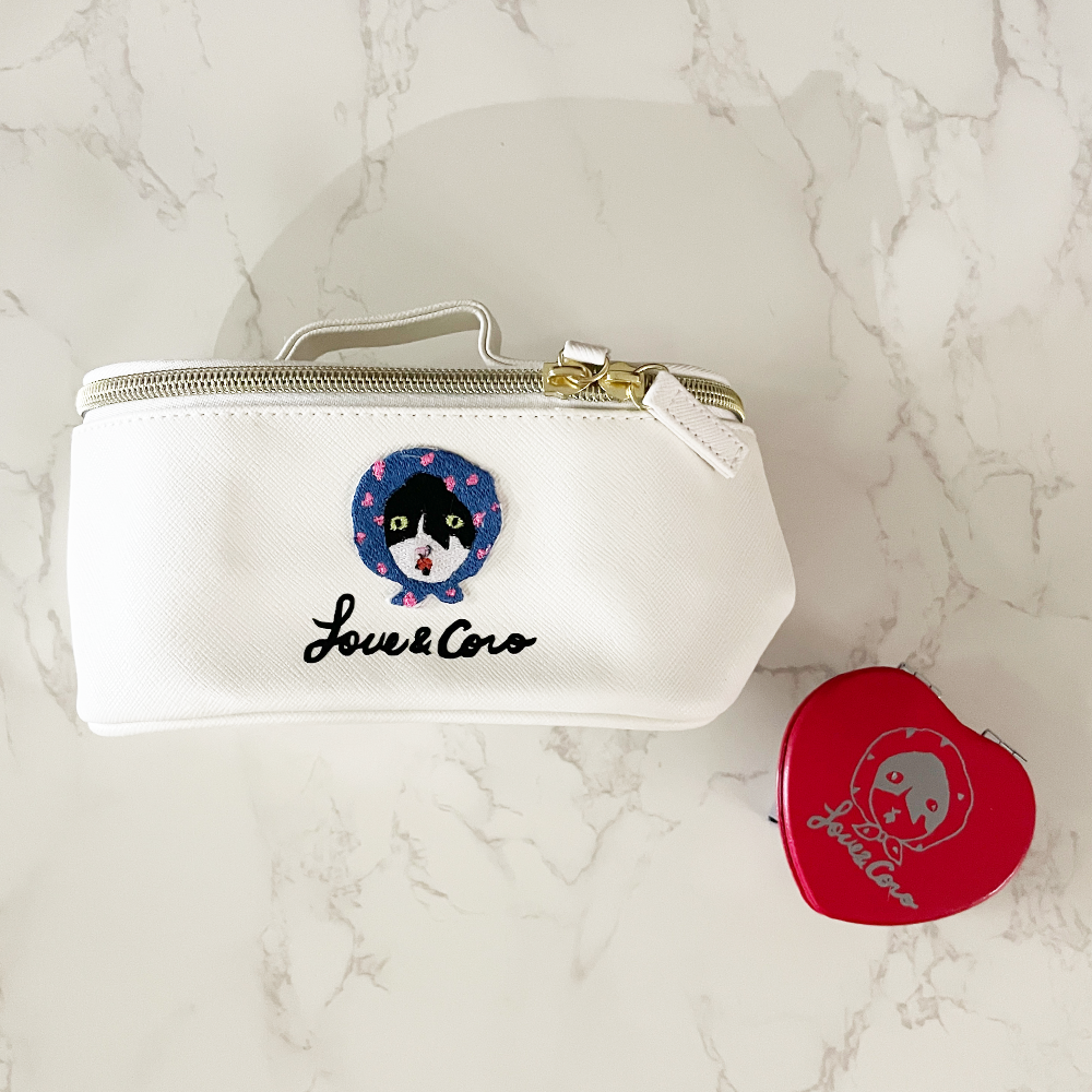 おしゃれなコロちゃんにふさわしいバニティポーチとハート型のコンパクトミラーのセットです。